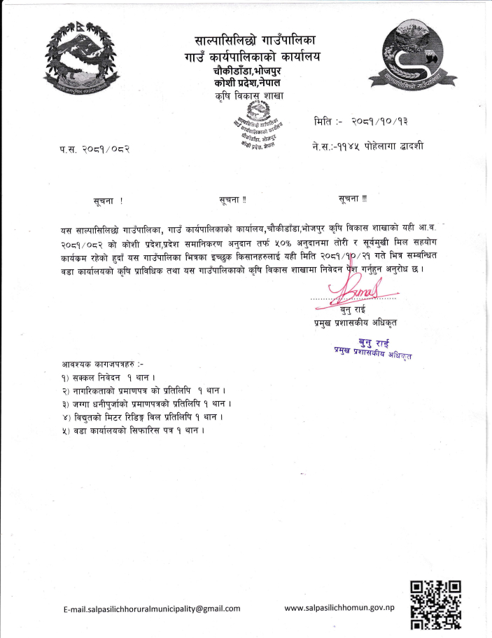 ५० अनुदानमा तोरी र सूर्यमुखी मिल सहयोग कार्यक्रम
